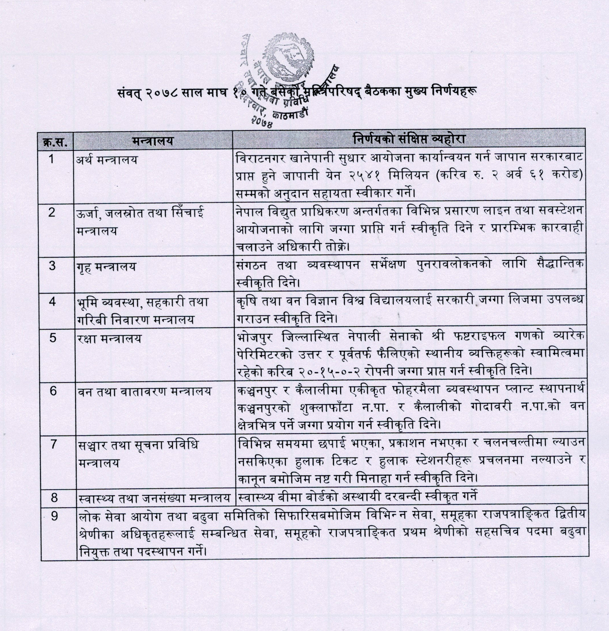 २०७८ माघ १० गतेको मन्त्रिपरिषद् बैठकका मुख्य मुख्य निर्णयहरु