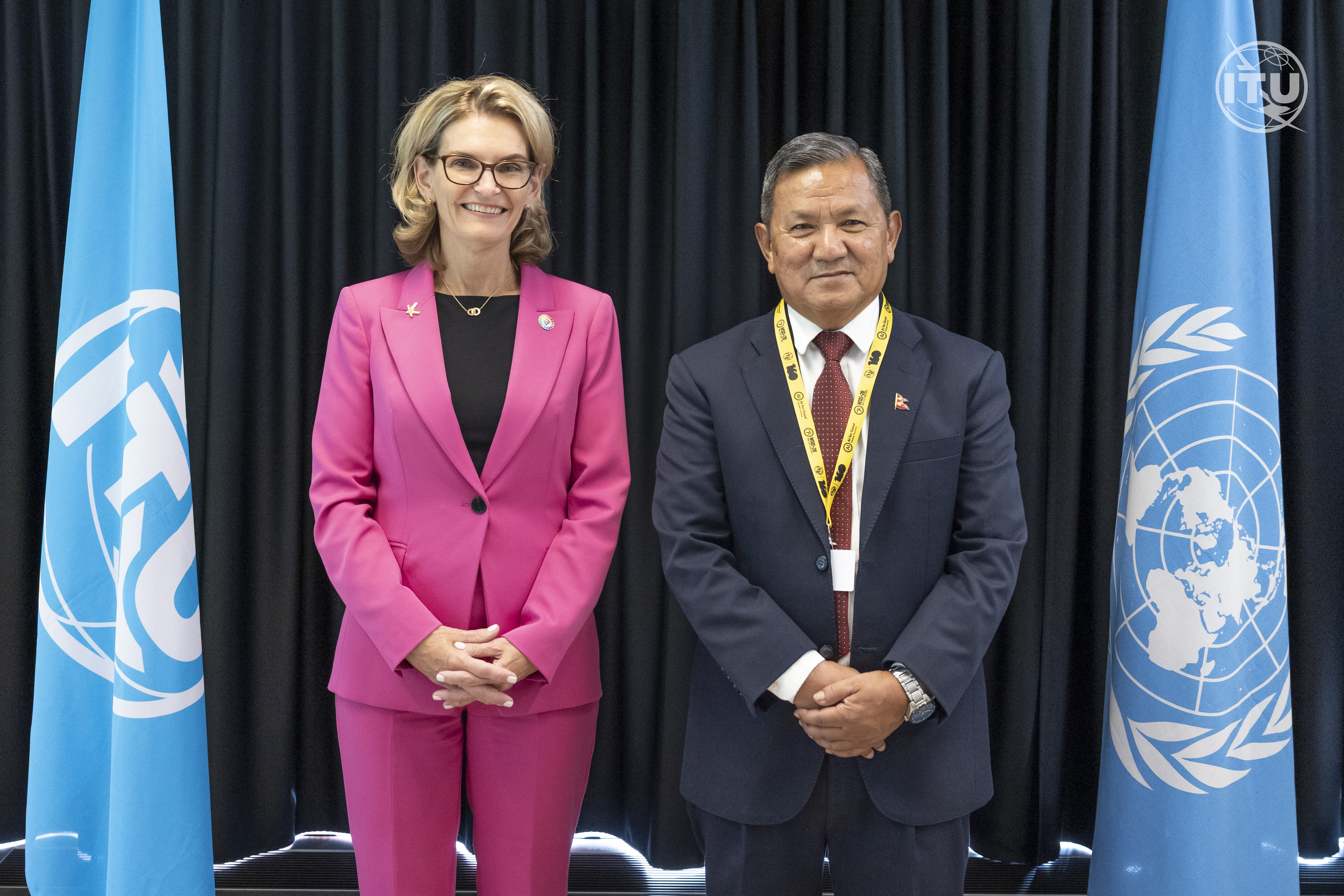स्विजरल्याण्डको जेनेभामा आयोजना भएको ए.आई संबन्धि कार्यक्रममा माननीय मन्त्रीज्यूले आई.टि.युकि महासचिव डोरिईन बोगदान मार्टिनसंग गर्नु भएको उच्च लेवलको वार्ता (तस्वीर :- आई.टि.यु, २०८२-०३-२७)।