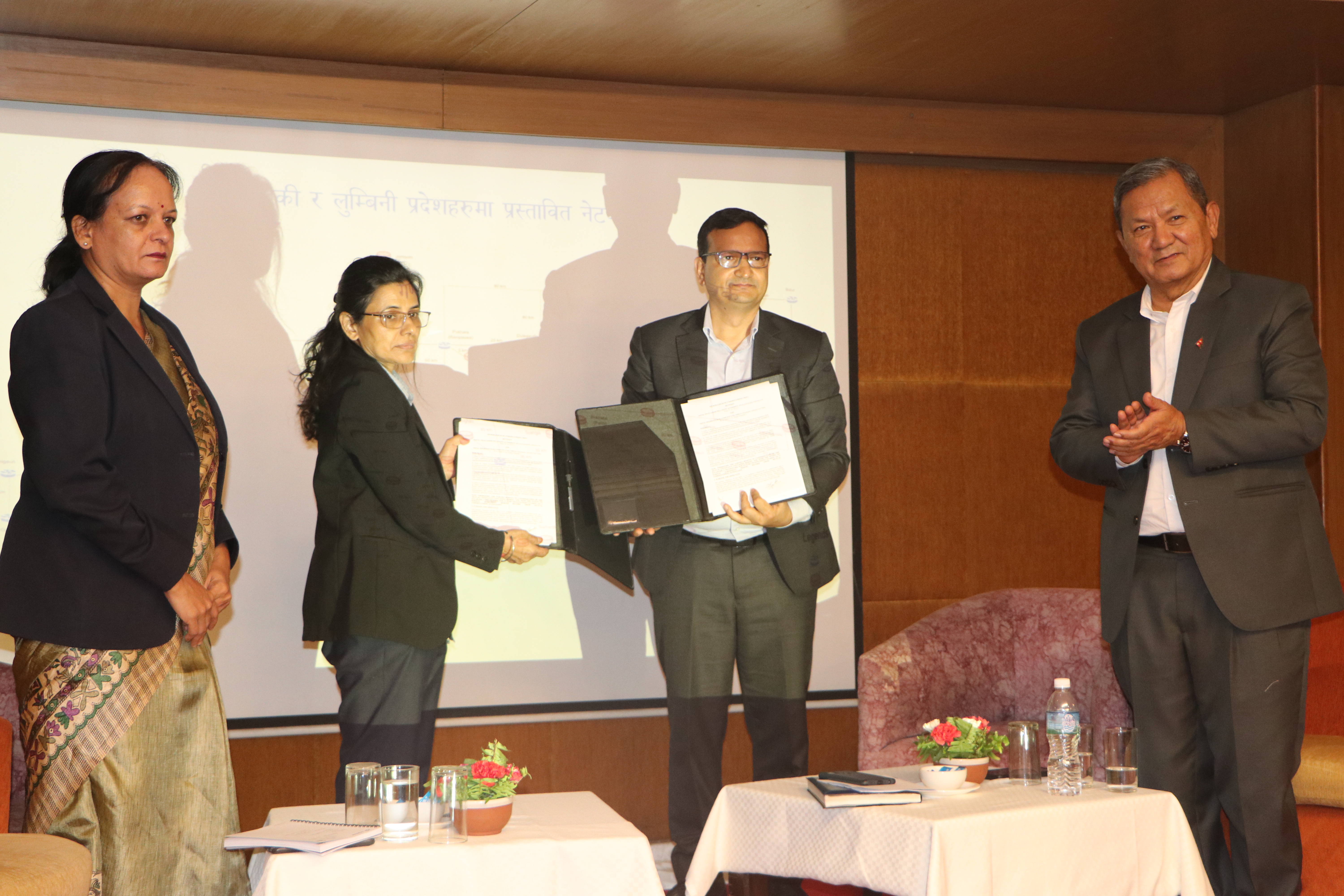नेपाल दूरसंचार प्राधिकरण र नेपाल टेलिकम बिच गण्डकी र लुम्बनी प्रदेशमा अप्टिकल फाइबर नेटवर्क विस्तार गर्ने सम्बन्धि समझदारी पत्रमा हस्ताक्षर कार्यक्रममा माननीय सञ्चार तथा सूचनाप्रविधि मन्त्री पृथ्वीसुब्बा गुरुङ ।