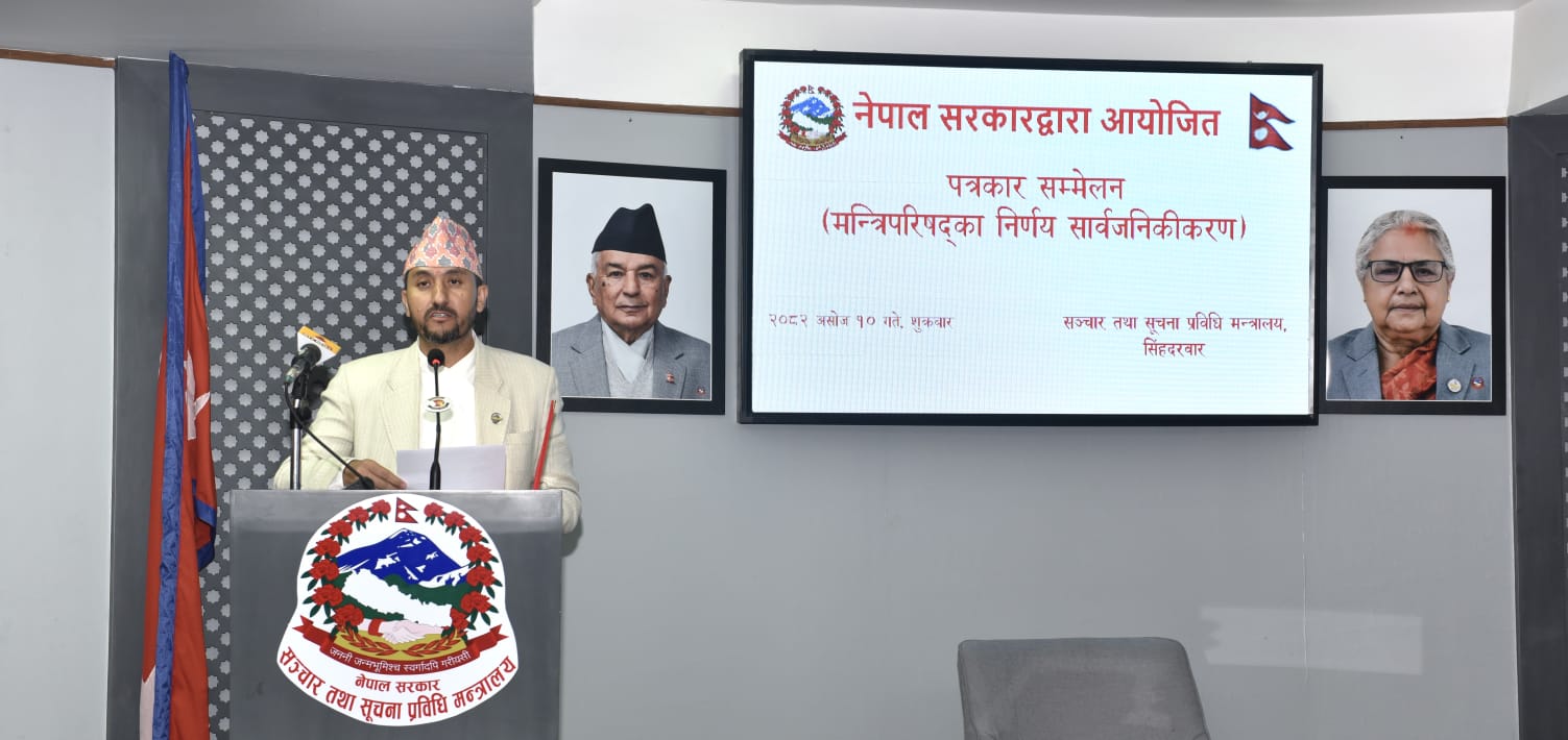 माननीय सञ्चार तथा सूचना प्रबिधि मन्त्री जगदीश खरेल ज्यूबाट नेपाल सरकार मन्त्रिपरिषद्को बैठकको निर्णय सार्वजनिकिकरण कार्यक्रम २०८२ असोज १०
